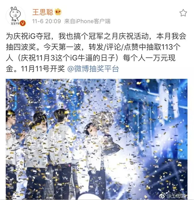 成功的案例,就是近王思聰舉辦的微博抽獎活動。11月3日,王思聰旗下電競公司IG獲得英雄聯盟S8全球總決賽,創造了中國電競新歷史,為了慶祝這戰績,他舉辦了四場活動,也就是抽四次獎,11月6日次抽獎,獎品為113個人每人一萬元的現金,優厚的獎勵使網友們紛紛參與其中。